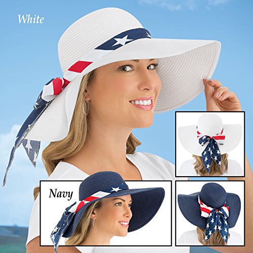 Studio : Winston Brands Publisher : Winston Brands Binding : Apparel Product Description Womens Wide Brim Floppy Hat With Usa Flag Patriotic Scarf Tie Description Headed to a parade, barbecue or a party at the beach? This wide-brimmed hat is the perfect accessory to protect you from the sun and show off your patriotic pride. In your choice of white or navy blue, the stylish hat is finished with a festive stars and stripes bow scarf. One size fits most. Polyester; imported. 17 1/2"Dia. Colors available in White or Navy. 0