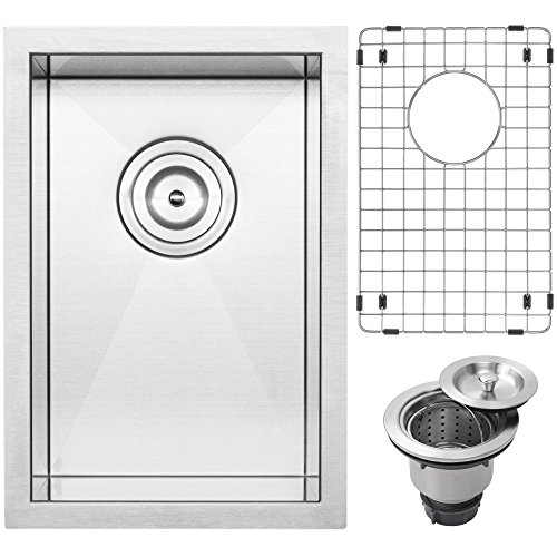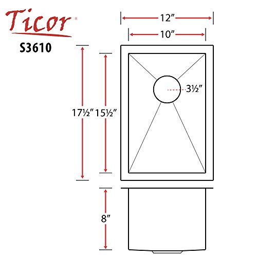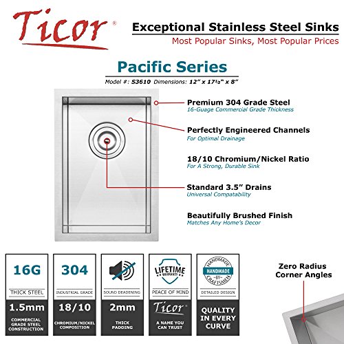 12" Ticor S3610 Pacific Series 16-Gauge Undermount Stainless Steel Single Bowl Zero Radius Square Kitchen Bar Sink with Accessories