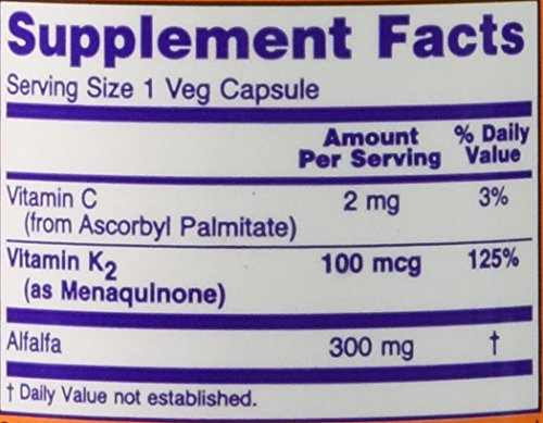-. Binding : Health and Beauty -. Brand : Now Foods -. EAN : 0733739009906 -. Label : Now Foods -. LegalDisclaimer : Contains no:  sugar, salt, wheat, gluten, soy, milk, egg, shellfish or preservatives. Vegetarian/Vegan Product. Caution:  Consult your health practitioner before consumption if you are currently taking any anti-coagulant drugs (such as warfarin, coumadin, heparin), or if you are pregnant/lactating. Do Not Eat Freshness Packet.  Keep in Bottle. Vcaps® is a registered trademark of Capsugel. Store in a cool, dry place.  Please Recycle. -. Manufacturer : Now Foods -. MPN : 0990 -. PackageQuantity : 1 -. PartNumber : 0990 -. ProductGroup : Health and Beauty -. ProductTypeName : HEALTH_PERSONAL_CARE -. Publisher : Now Foods -. Studio : Now Foods -. Title : Now Foods VitK-2 100 mcg 100 Vcaps (2 Pack) -. UPC : 733739009906