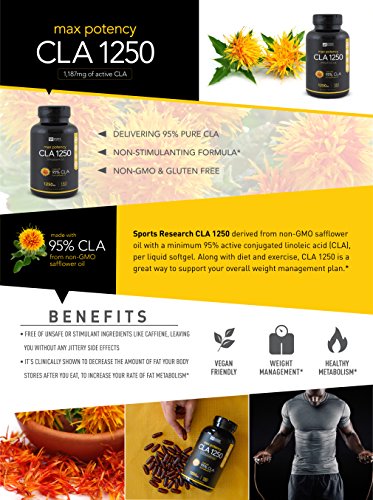 Want to slim down tone up? Our plant-derived formula harnesses the science-backed power of CLA to support healthy weight loss. CLA 1250 by Sports Research is trusted by thousands of people who want to look feel their best! Its key ingredient is Conjugated Linoleic Acid (CLA) which studies suggest may work in these 4 ways: ? Decreases number and size of adipocytes (fat cells), lowering your body fat mass. ? Decreases the activity of LPL enzymes which help to store triglycerides (fats) in adipocytes (fat cells). With regular use of CLA, less fat gets stored. ? Increases apoptosis, the rate at which fat cells disintegrate, thus reducing the number of existing fat cells in your body. ? Increases activity of the enzyme CPT (carnitine palmitoyltransferase), so fat is burned up faster, leaving less of it in your body.* How is our CLA different? It contains the highest potency of active CLA on the market today-95%. ? High potency formula ? Plant-derived, non-GMO ? No artificial ingredients or preservatives ? Made in the USA Contains no dairy, egg, peanut, shellfish, soy, wheat, yeast, tree nuts or fish. Add to Cart Now - It's Guaranteed! * PubMed.gov; "Conjugated linoleic acid reduces body fat in healthy exercising humans;" Thom E1, Wadstein J, Gudmundsen O. ** Bodybuilding.com; "CLA: Conjugated Linoleic Acid Research," M. Hajoway Click "Add to Cart" to buy now! 0 |