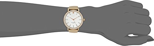 Kate Spade 1YRU0446 Metro Grand New York women's watch features a 38mm wide and 5mm thick rose gold ion plated solid stainless steel case with a crystal accented fixed bezel and textured push-pull crown. Kate Spade 1YRU0446 is powered by an accurate Japanese quartz movement. This beautiful watch also features a textured brushed finished silver tone dial with rose gold tone luminous hands and crystal accented index hour markers, scratch resistant mineral crystal and water resistant to 30 meters. Kate Spade 1YRU0446 is equipped with an 18mm wide genuine beige leather strap with a buckle clasp. Kate Spade 1YRU0446 women's Metro Grand silver dial beige leather strap watch is brand new and comes in an original Kate Spade gift box and is backed by a 2 years store warranty.Feature