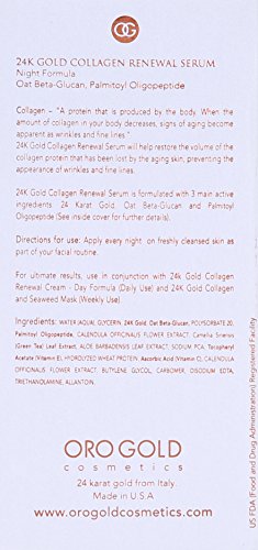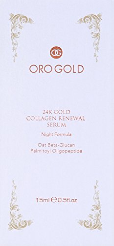 -. Binding : Misc. -. Brand : Oro Gold -. Color : Clear -. EAN : 0797734129144 -. Feature : Penetrates right down to the deeper layers of the skin / Stimulates collagen growth to maintain and improve skin tone, firmness, flexibility, and elasticity / Assists in modulating the inflammatory response and is known for evening out pigmentation / Formulated with 2 main active ingredients: 24 Karat Gold and Oat Beta-Glucan / The overall result is a more youthful complexion -. Label : Oro Gold -. Manufacturer : Oro Gold -. Model : 797734129144 -. MPN : 797734129144 -. NumberOfItems : 1 -. PackageQuantity : 1 -. PartNumber : 797734129144 -. ProductGroup : Beauty -. ProductTypeName : BEAUTY -. Publisher : Oro Gold -. Studio : Oro Gold -. Title : Oro Gold Collagen Renewal Serum, 0.5-Ounce -. UPC : 797734129144