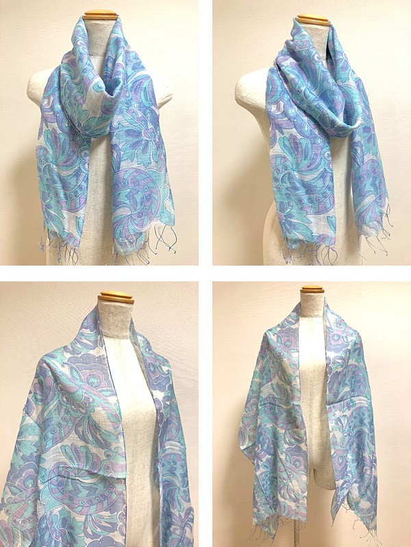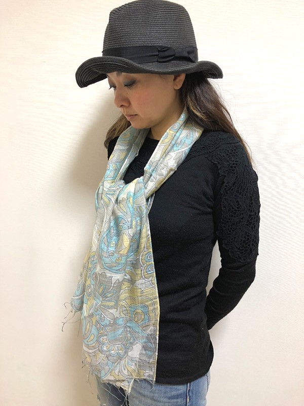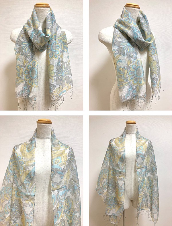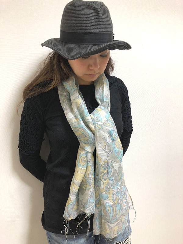オリエンタルなモチーフが目を惹く、天然素材のストールです。シルクとコットンのオーガニックな素材感と色彩が、オトナ女子の春夏コーデに軽やかさと爽やかさをプラス☆淡く落ち着いた色合いだから、合わせやすく、上品で華やかな印象も醸します♡軽めの巻き心地だから、夏へ向けての日よけ対策に活用できるのもうれしい◎。カラーは、ライトグレーとブルーの2色展開です。