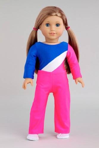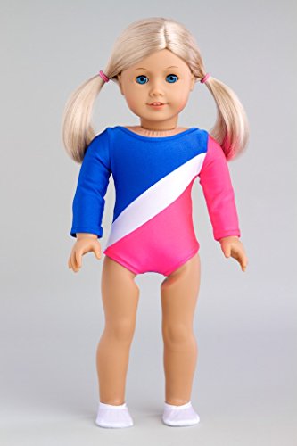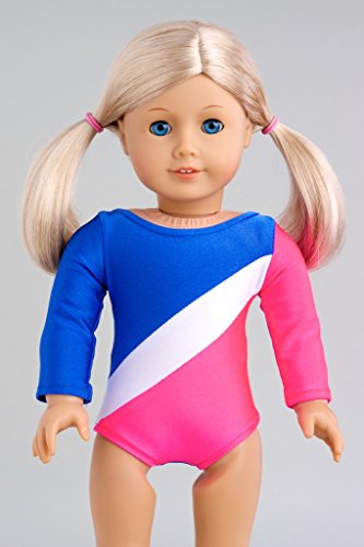 Now your doll is ready for a gymnastic competition in this pink, blue and white leotard.