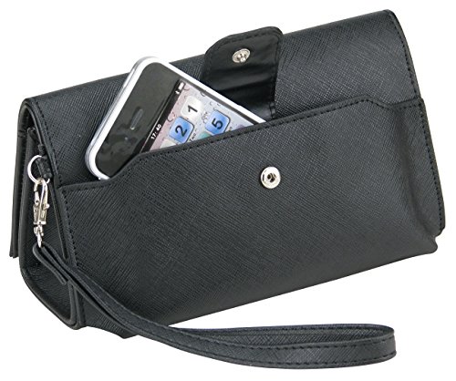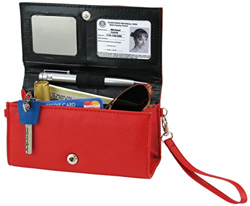 Glasses case with mirror, I.D window, cash wallet, RFID Blocking card slots, with Outer phone pouch engineered to to fit any size phone + phone case. Can be wristlet or cross body.