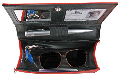 A glasses case, wallet, phone case, and purse all in one! Includes a large zipper pocket for keys, bills, coins...