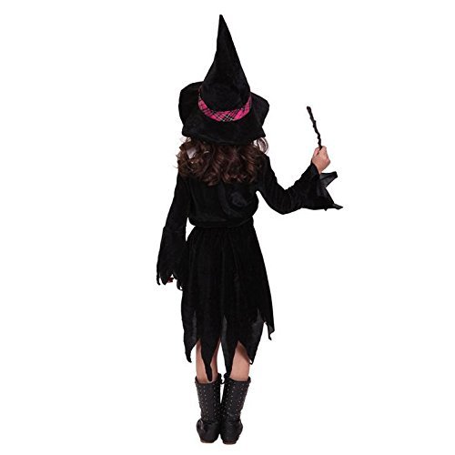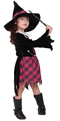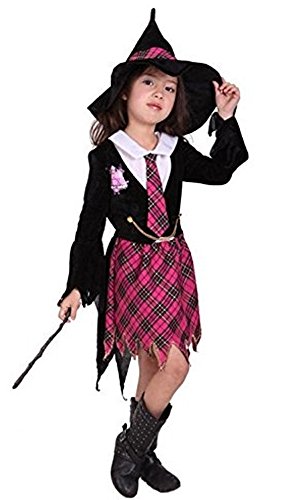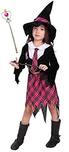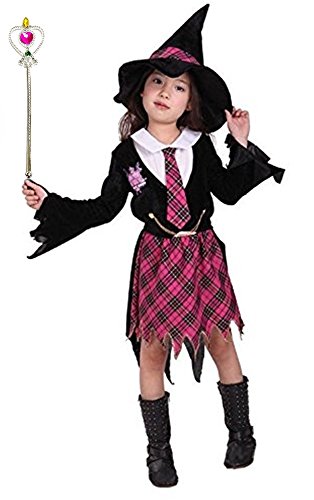 상품명: Madrugada 할로윈 의상 마법 학원 귀여운 마법소녀 키즈 코스튬 소녀 체크 무늬 3점 세트 (넥타이 부착 제복+마녀 모자+하트의 스틱) S271