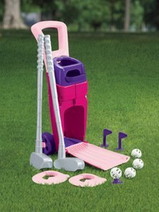 Let your little girl tee up for loads of fun This fantastic golf Play set features a hard-side pink and purple golf bag with wheels two clubs four balls two flags and two putting holes. The front of the bag folds down for extra putting practice too.Features. Material - Plastic.. Size - 7 x 7 78 x 21 38 high in.. Item Weight - 2.8 lbs.. Ages 1.5 and up. Some Assembly Required.Feature