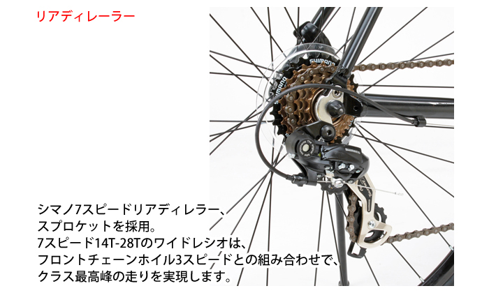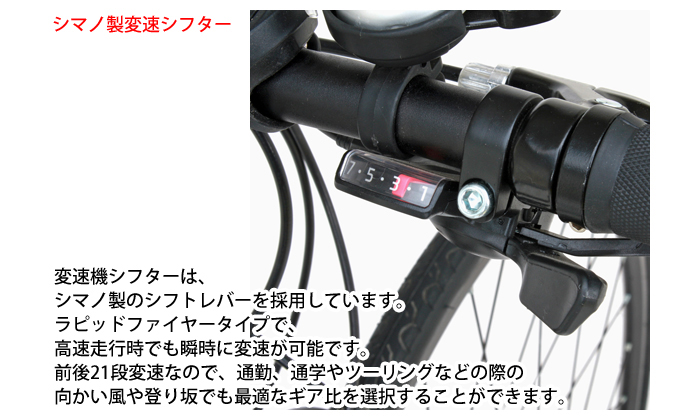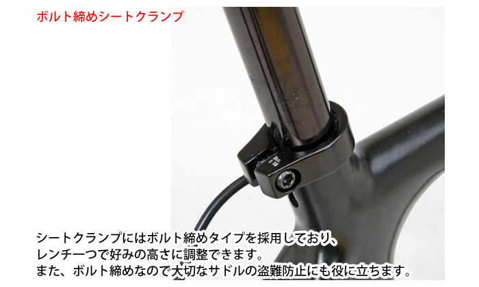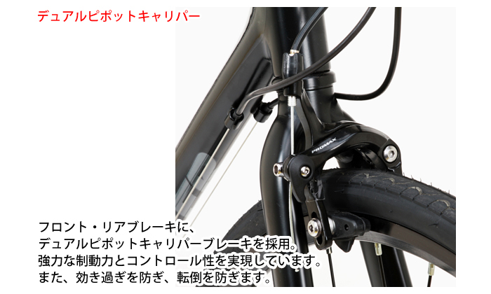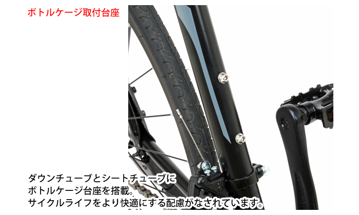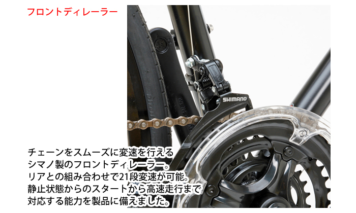 ●エアロ形状に成型された溶接部はフレーム強度の向上とデザイン性を両立、変速にはシマノ製を使用しあらゆる路面に瞬時に対応します。