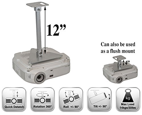 This mount can be used to lower your projector 4" below the ceiling or with the extension, 12" below the ceiling. WHILE I SHOULD BE FLATTERED THAT ANOTHER SELLER IS USING PICTURES OR OUR MOUNTS TO SELL THEIRS, IT IS REALLY NOT FAIR TO THE CONSUMER OR US. If it looks like our projector mounts but doesn't say "Projector-Gear" in the title, it is not a REAL Projector-Gear mount. We are proudly the highest rated and most sucessful projector mount seller on ebay: Kramerica_incorporated, and have a 100% rating with over 20,000 feedback! We have been at the top for years and had lots of people trying to copy our designs, but this is the first time we had another seller actually use our mounts in their pictures. I can't blame them though. Our mounts look MUCH NICER! KIT INCLUDES: 1. Projector Ceiling Mount 2. 12" Extension - projector can be mounted 4" or 12" below ceiling 2. Hardware to attach the mount to the projector and the projector to the ceiling 3. Easy to follow installation instructions (with lots of pictures). KEY FEATURES: Low Profile - 4" Below the Ceiling 100% Aluminum Design Projector-Gear mounts are the World's Best Selling Aluminum Projector Mounts NO ASSEMBLY REQUIRED - Fully Assembled Out of the Box Fully Adjustable Mount - Can Be Fine Tuned by Hand Quick Release from the Ceiling CNC Precision Machined 6061 T6 Aluminum (Aircraft Grade) Designed Specifically for Your Projector - Quickly Bolts Right On Buy with Confidence: Our mounts are designed and manufactured in the USA by Projector-Gear, LLC. Projector-Gear mounts have been sold worldwide on ebay for years and have a 100% rating on over 20,000 feedback.