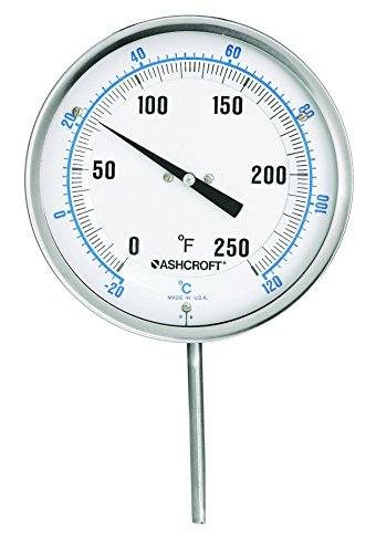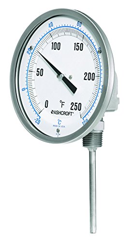 Ashcroft Series EI Stainless Steel Case Bimetal Thermometers, 5" Dial Size, 1/2" NPT Every angle Connection, 6" Stem Length, 30/130 Degrees Fahrenheit