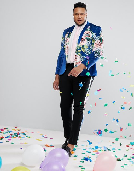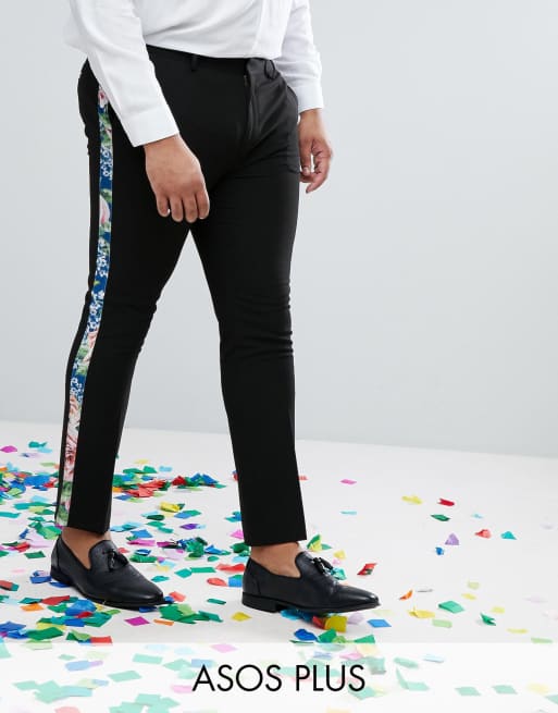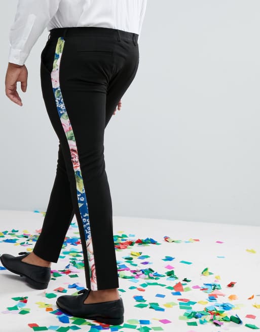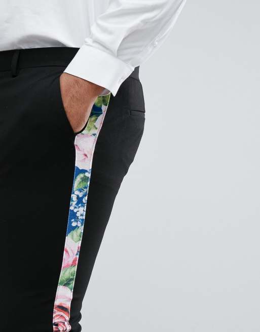 ASOS PLUS Super Skinny Suit Pants With Teal Floral Print Velvet Side Stripe