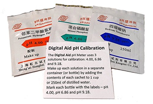 Digital Aid pH Buffer Solution Powder for Perfect pH Meter Calibration. Light and Portable Just Add Distilled Water. Makes 3 Cups or 8Oz Jars. 1 of Each 4.00pH, 6.86pH, and 9.18pH Solution.