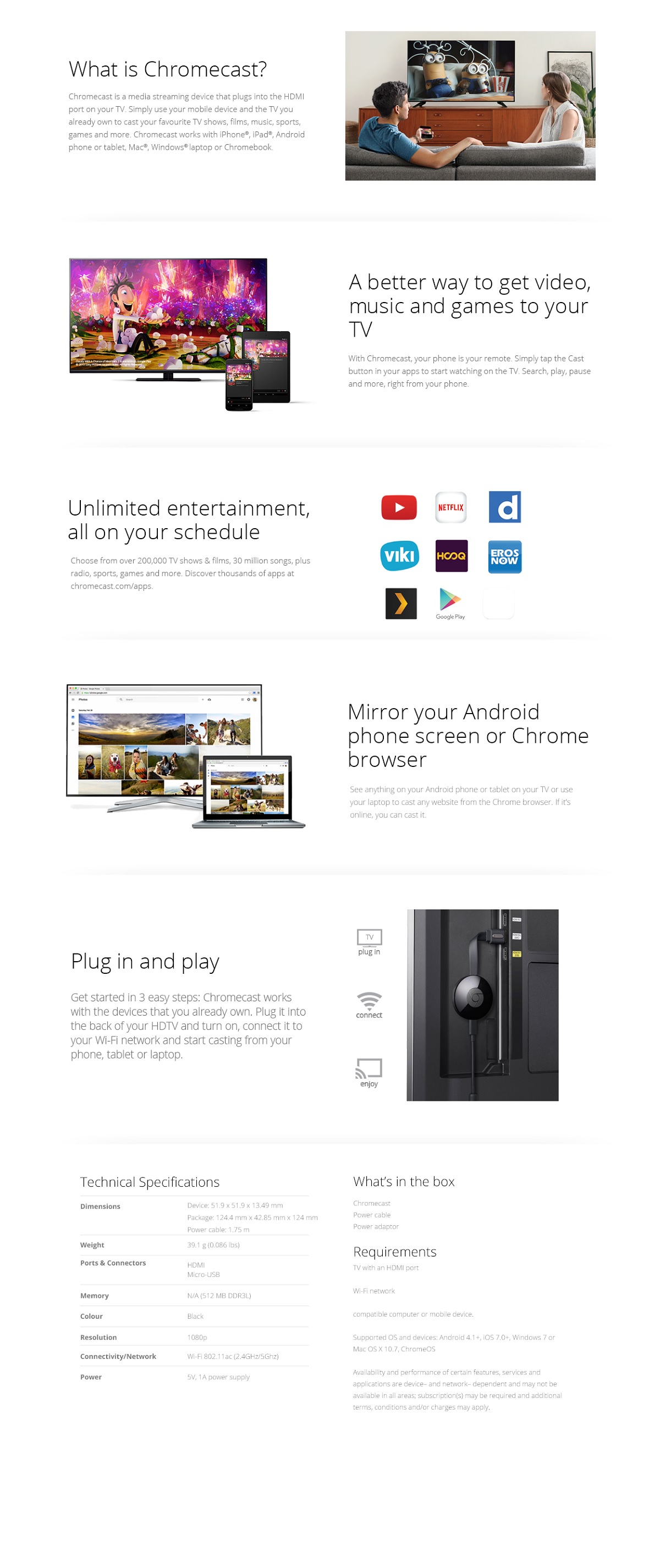 Chromecast is a media streaming device that plugs into the HDMI port on your TV. Simply use your mobile device and the TV you already own to cast your favourite TV shows, films, music, sport, games and more. Chromecast works with iPhone®, iPad®, Android phones and tablets, Mac® and Windows® laptops and Chromebooks.