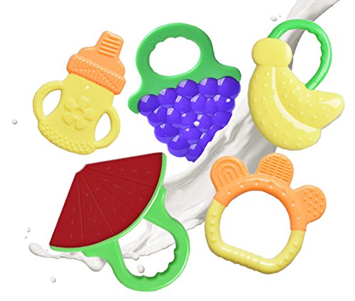 ?PRODUCTS DETAIL:The package includes 5pcs baby molars (Bells, kettles, grapes, watermelons, bananas).It brings your baby different chewing senses to help the baby to the perception of things.