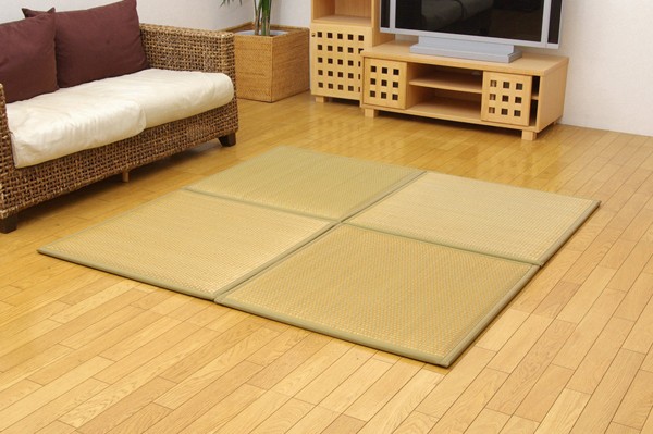 届いたユニット畳を床に置くだけで和のスペースが出来上がります。表生地には国産(九州産)のい草を使用しています。一本一本が太く、表皮が厚く、繊維がキメ細かいので弾力性があり、耐久性に優れています。い草には空気の自然浄化作用、湿度の調節作用などがあります。また汚れにくく、使用するうちに黄金色に変化し、味が出ます。中材には10mm厚の低反発ウレタンと12mm厚のフェルトを使用し、やわらかく、ふっくらしたボリューム感を実現しました。低反発ウレタンはマシュマロやお餅のような包み込むような柔らかさがあります。また耐衝撃性、エネルギー吸収性に優れ、耐圧分散性に非常に優れています。遮音特級LL30を取得しておりますので、床下への気になる騒音を軽減する効果もあります。軽量タイプなので、持ち運び、設置、片づけなども楽にできます。連結用ジョイントを使用すれば、お部屋に合わせて簡単に何枚でもつなげることが出来ます。