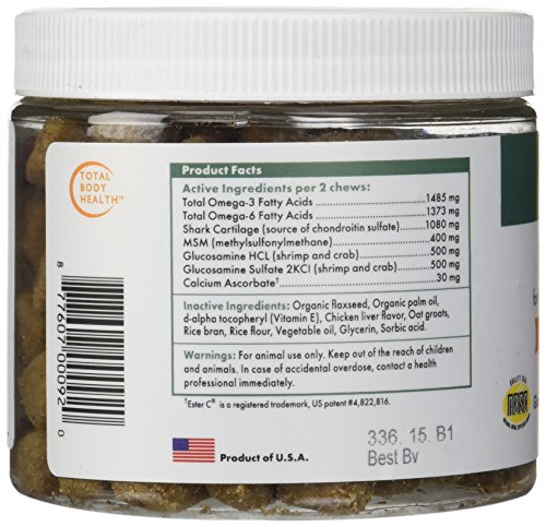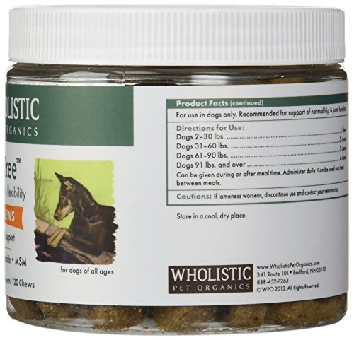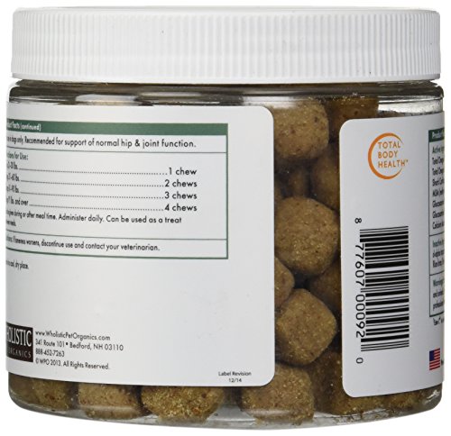 Wholistic Pet Organics Joint Support Soft Chews provide targeted joint support for dogs of all ages. This joint supplement is packed with glucosamine, chondroitin, and MSM, the three most powerful substances for improving joint functioning and increasing mobility. As your pup gets older, their mobility tends to suffer. Joint supplements can help slow down or reverse this process by lubricating joints and helping to restore joint tissue. Wholistic Pet Organics Soft Chews are recommended to help support normal hip and joint function. Soft chews are easy to administer Provides targeted joint support for dogs of all ages Glucosamine, chondroitin, and MSM Helps improve mobilityFeature