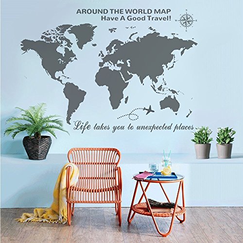 Higoss Large World Map Wall Decal With Compass Travel Quotes Wall Decal Vinyl Sticker for Home Office Wall Decor, Black