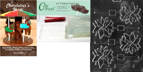 Cybrtrayd Poinsettia Lolly Chocolate Mold with Chocolatier's Bundle of 25 Lollipop Sticks, 25 Cello Bags, 25 Red Twist Ties and Chocolatier's Guide