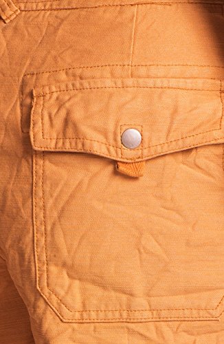 Welt seams detail carry-all pockets on the front and flap pockets on the back of a pair of cutoff cotton shorts.