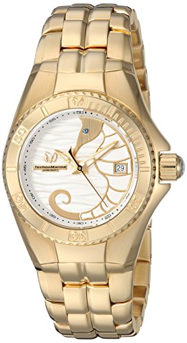 Yellow gold-plated stainless steel case and bracelet. Uni-directional rotating yellow gold-tone bezel. Silver dial with luminous yellow gold-tone hands. Minute markers around the outer rim. Dial Type: Analog. Luminescent hands. Date display at the 3 o'clock position. Quartz movement. Scratch resistant flame fusion crystal. Screw down crown. Solid case back. Case size: 30 mm. Round case shape. Band width: 26 mm. Deployment clasp with a push button release. Water resistant at 200 meters / 660 feet. Functions: date, hour, minute, second. Casual watch style. TechnoMarine Cruise Dream Silver Dial Ladies Watch 115284.Feature