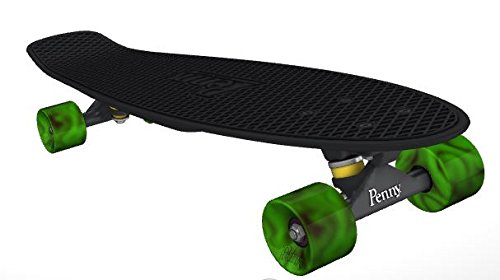 -. Feature : Black Deck, Black/Green Trucks, Black Green Swirl Wheels / 27" Deck / Penny Plastic Cruiser