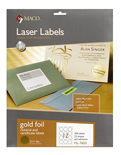 MACO Laser Gold Foil Notarial and Certificate Labels, 2-1/2 Inches in Diameter, 12 Per Sheet, 300 Per Pack (ML-7850)