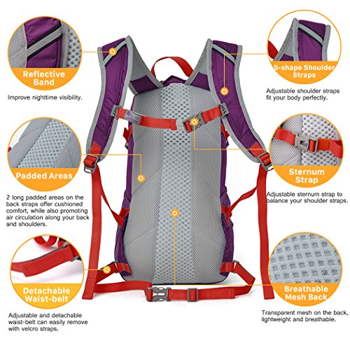 -. Feature : MATERIAL- Polyester ,Water-resistant Polyester as the fabric do not allow water to easily penetrate. / CAPACITY- 15L (915 cube inches).Hydration bcakpack for cycling, hiking, running, biking, climbing etc. Lightweight and breathable pack perfect for your bicycle or day-hike adventures. / HYDRATION SYSTEM COMPATIBLE- Internal hydration bladder's compartment and on the top for the water tube outlet . Big engugh for 2 liters hydration bladder. (Hydration bladder not included). / BEARING SYSTEM- 2 long Padded Areas on the back straps offer cushioned comfort, while also promoting air circulation along your back and shoulders. S-shape adjustable shoulder straps fit your body perfectly. / DETACHABLE WAIST-BELT- Adjustable and detachable waist-belt can easily remove with velcro straps