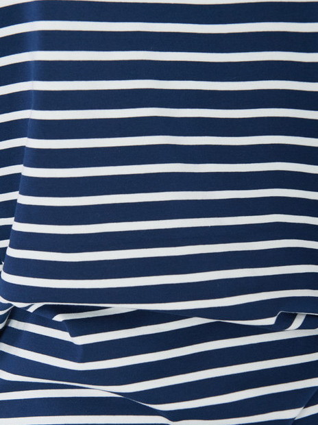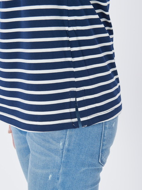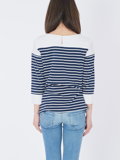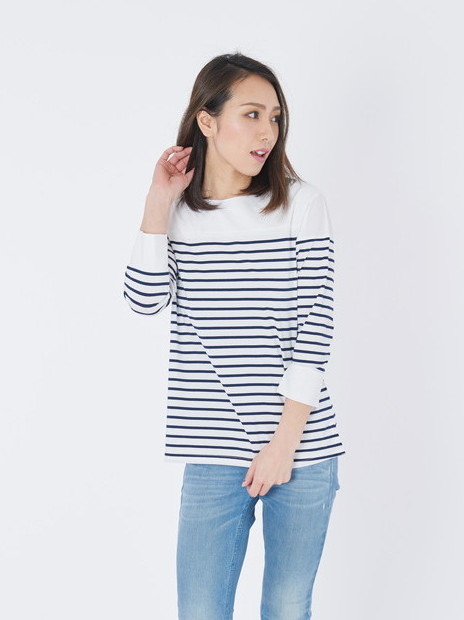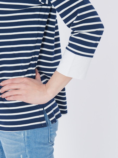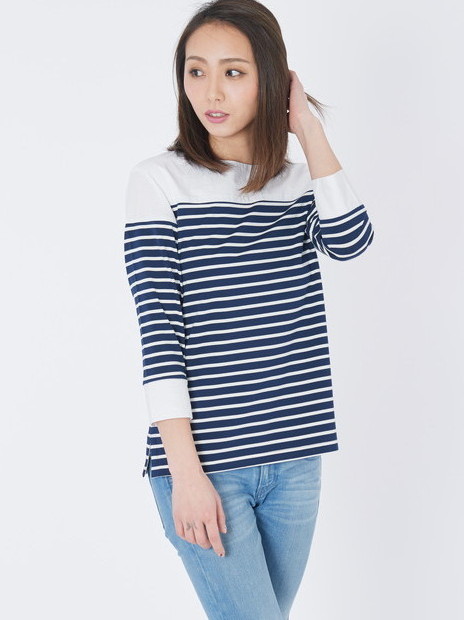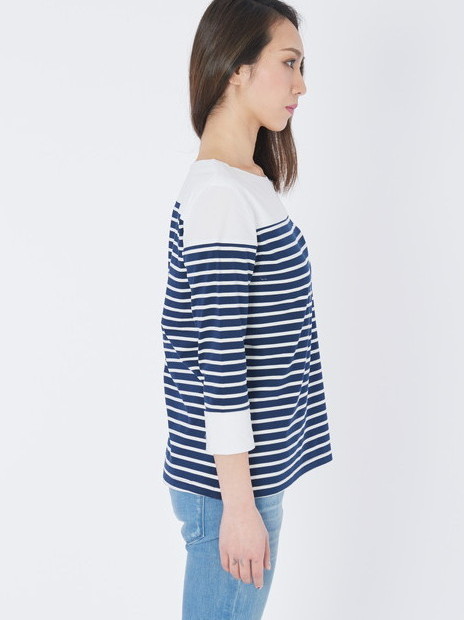 肩からフロントにかけて無地の布帛を組み合わせたボーダーカットソーです。ブラウスのような女性らしい着こなしをお楽しみいただけるアイテム