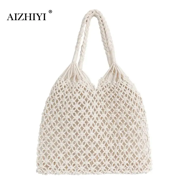 シンプルな女性中空アウトメッシュバケツショルダーバッグ夏ビーチ綿ロープ織ハンドバッグトート