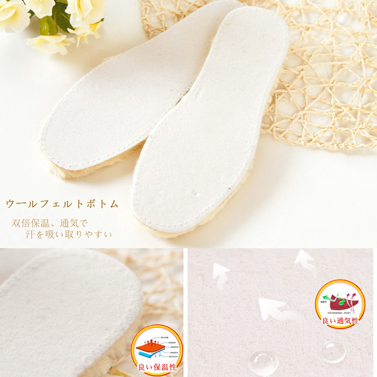 The felt has a thickness of 4 mm, locking the heat emanating from the foot, wool is dense and fluffy, the warmth is doubled than the normal insoles.