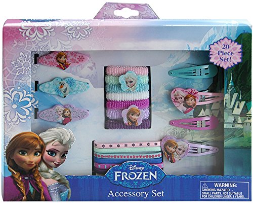 Includes: 3 barrettes, 4 snap clips, 6 elastics, 7 terries Features images of Frozen characters Elsa and Anna Ages: 3+ great for party favors Brand : Frozen MPN(PartNumber) : FZ20 EAN : 0678634485212 Product Dimensions(LxWxH) : 25x22x8cm ; 59 g Package Dimensions(LxWxH) : 25x22x8cm ; 59 g