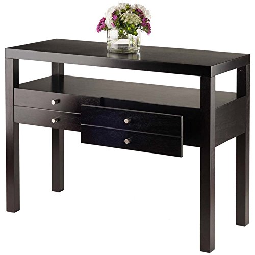 -. Feature : Overall size is 30"H x 40"W x 17.1"D / Two easy-glide drawers and a broad open shelf / Made of solid and composte wood / Ships in 1 box