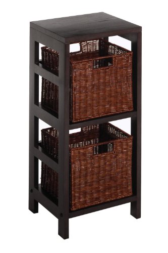 -. Feature : elegant shelving unit with its two wicker baskets fulfills both style and functional requirements