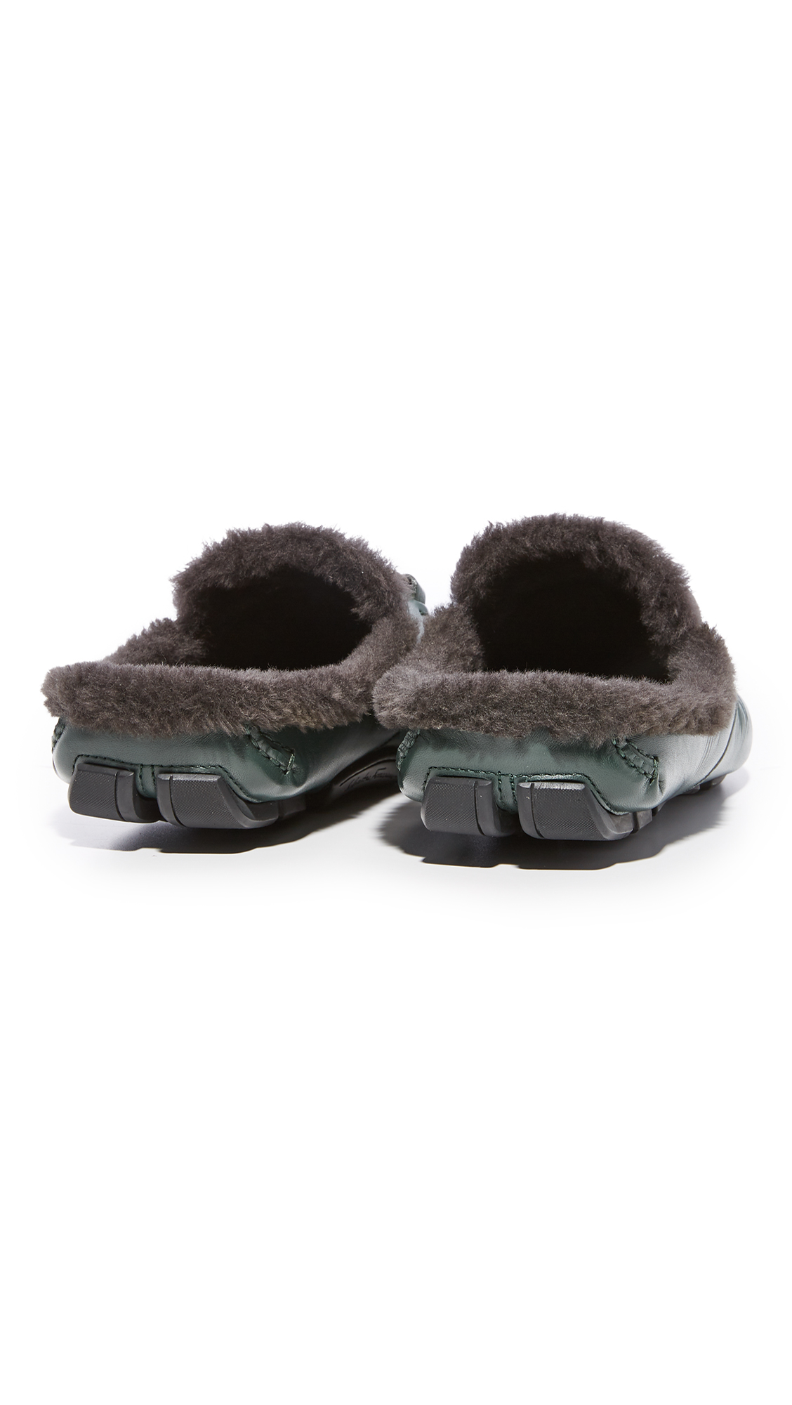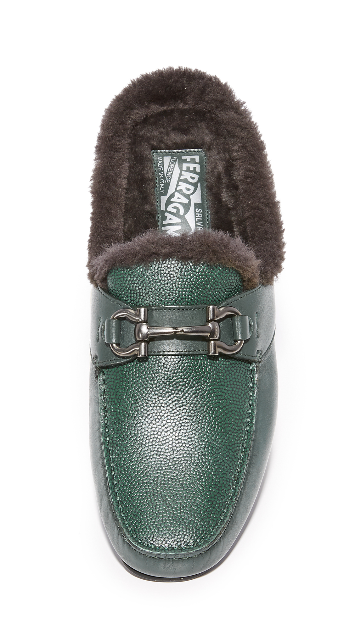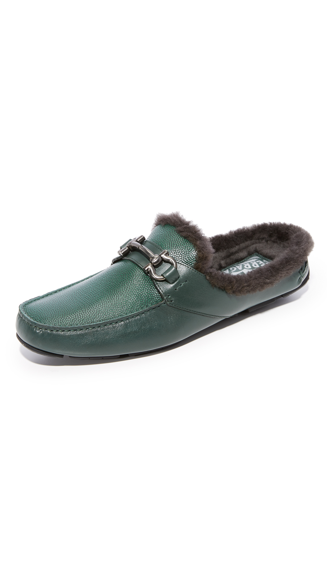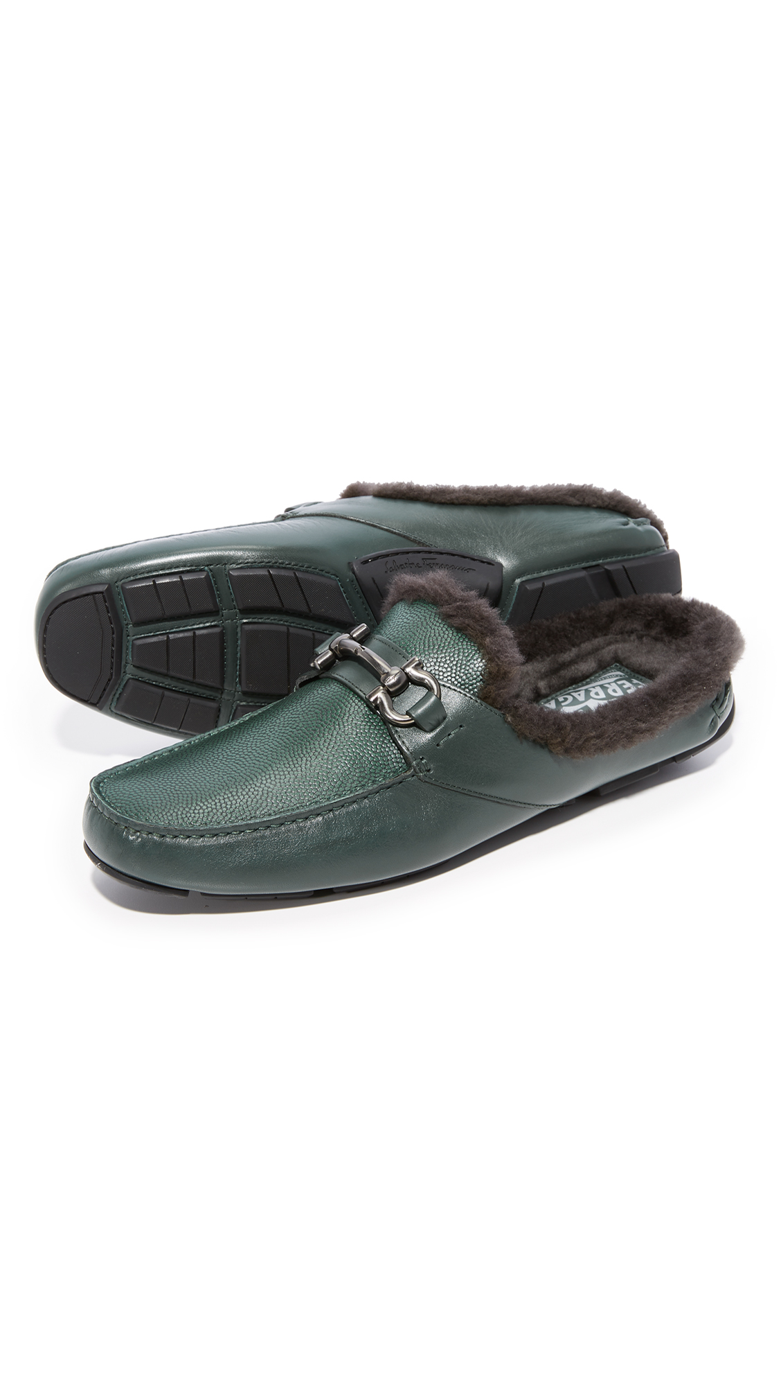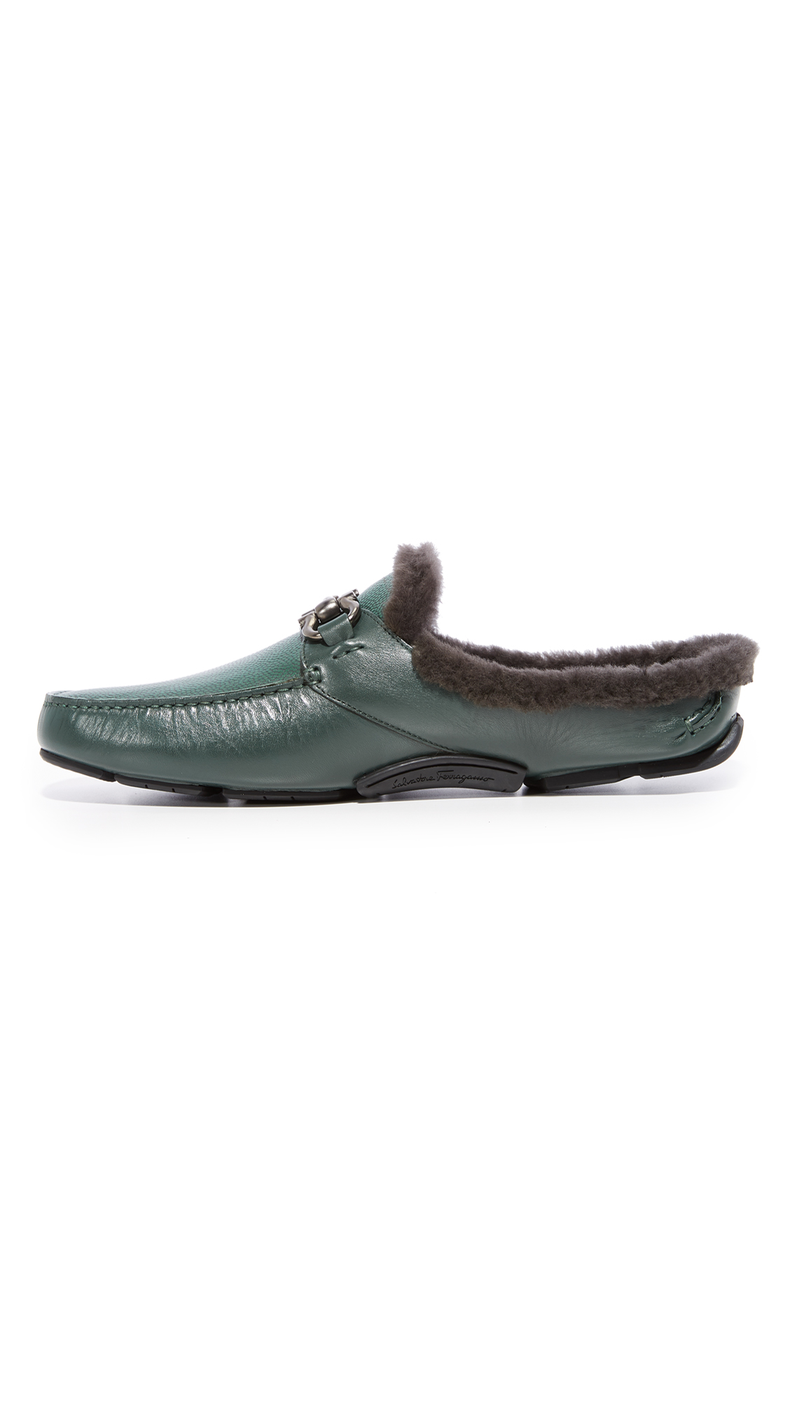 Driver-style Salvatore Ferragamo slides with a warm shearling lining. Pebbled-leather vamp and smooth-leather midsole. Rubber grips extend from the soft leather sole to the heel.