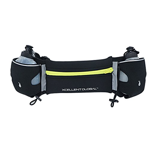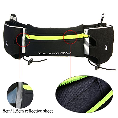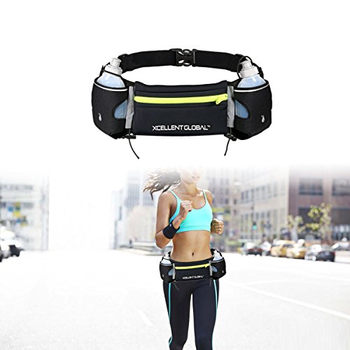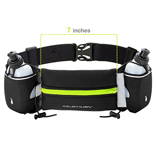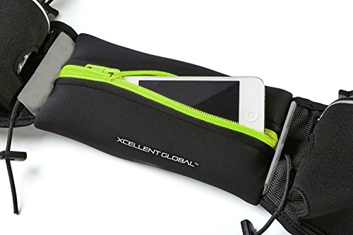 - Carry your money, ID, keys, energy gels, and other items in the 7 inch main pocket of our runner's waist bag including your iPhone, Galaxy, HTC, Blackberry or other popular cell phones. - Stay hydrated since our running belt offers two roomy pockets that hold the included 6-ounce water bottles comfortably. The hydration belt comes with two elastic straps to secure water bottles to the runner's waist bag and prevent bouncing. - Be ready for the competition. Our runner's waist belt features two toggles to secure a racing number bib to the running belt. - Our running waist bag is not just for running. Use it for any activity like hiking, cycling, rollerblading, skiing, snowboarding, skateboarding, and even walking. - The belt adjusts up or down in size, so runners of all ages can use the bag when they are out on the trail, hitting the road or in the gym. - Be comfortable and enjoy no bouncing or chafing; water bottles stay in place thanks to our elastic straps that keep them secure and the belt rests comfortably on the hips thanks to our non-slip backing. - Stay safe; our belt comes with reflectors to be safe when you are active at night.