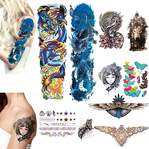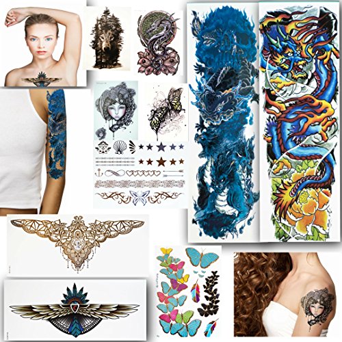 IN THE PACKAGE: You will receive a tube of 10 different Tattoos design sheets, Flowers, Dragons, Butterflies...... ranging from 4"X 5" 1/2 " to Full Arm Size. INCLUDING 3 sheets of metallic designs(plus a special BONUS) -They are packaged in a TUBE so that the larger tattoos are not damaged in shipping. The designs are as pictured above, tattoos for women, men, kids,metallic, large and minimal tattoos.