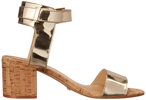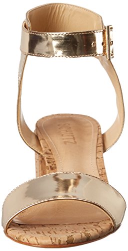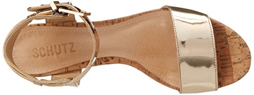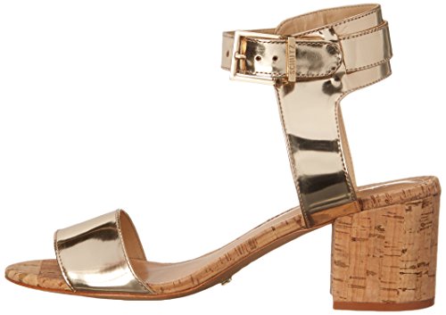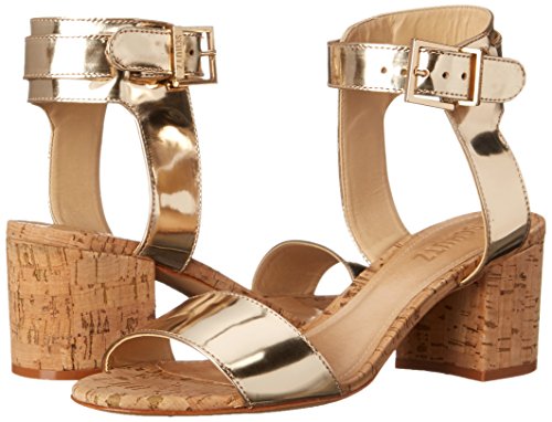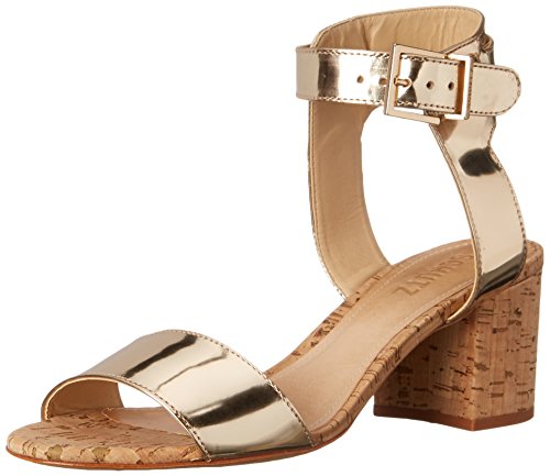 Metallic leather sandal featuring blocky cork heel and adjustable ankle strap with buckle closure