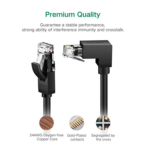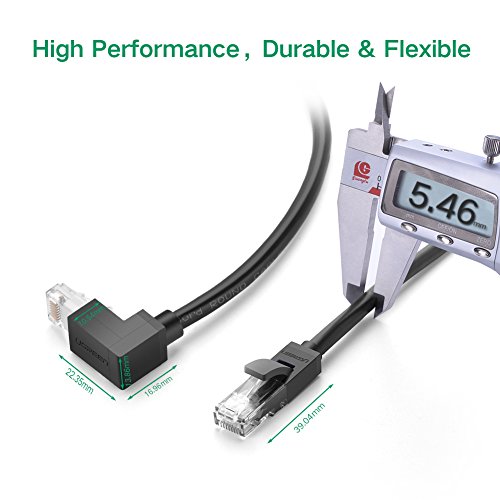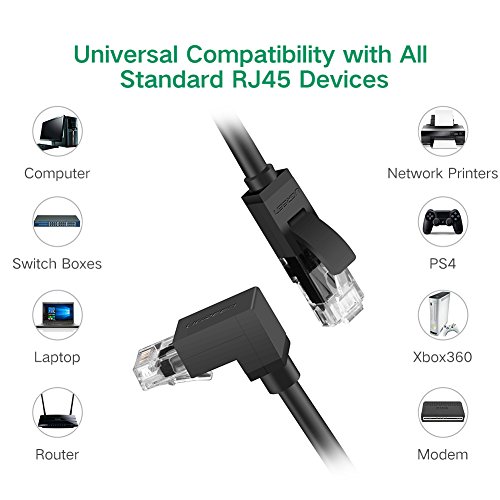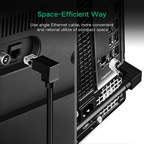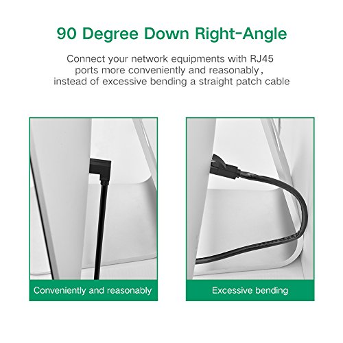 90 Degree Right-Angle Down: UGREEN Straight to Right Angle Network Cable provides you a perfect solution to connect the network devices in the compact space, like behind furniture or in a network closet. Instead of excessively bending a straight patch cable, use this angled Ethernet cable to connect your network equipments with RJ45 ports more conveniently and reasonably.