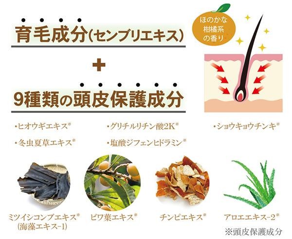 | 育毛成分のセンブリエキスに、9種類の頭皮保護成分(ヒオウギエキス・グリチルリチン酸2K・ショウキョウチンキなど)を配合した薬用育毛剤です。ブラシ一体型なので手を汚さず、ピンポイントに直接塗布できます♪脱毛を予防し、発毛を促進します。ほのかな柑橘系の香り☆ |