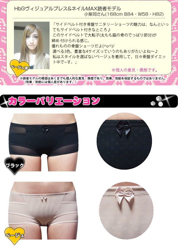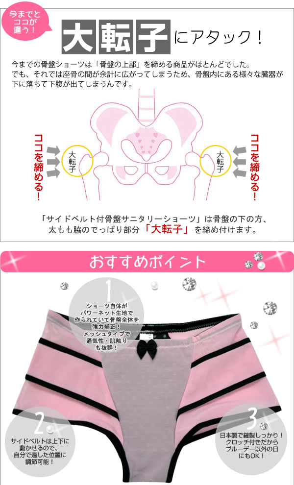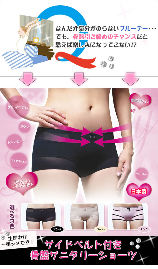 骨盤が最も柔軟なブルーデーに狙いを定めてグイッと締めあげる!ショーツ自体はもちろん、サイドベルトで大転子を締め付けるのがポイントキュートなデザインで読者モデルの間でも話題に★サイズS:ヒップ82~90cm、M:ヒップ87~95cm、L:ヒップ92~100cm、LL:ヒップ97~105cm重量個装:66g素材・材質ナイロン83%、ポリウレタン17%マチ部分:綿100%製造国日本裏地にゲルマニウム・トルマリン・チタンを塗布骨盤を補正しながらブルーデーも快適に過ごせる今ドキのサニタリーショーツ