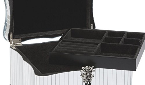 -. Feature : Glamour Classic Mirrored hand finished Jewellery Box / Opens to reveal black felt -lined interio / Multiple compartments and removable tray / Includes storage roll for rings / 7"H x 10"W x 10"D