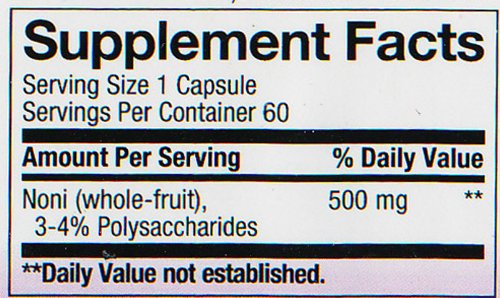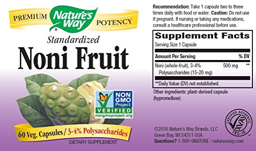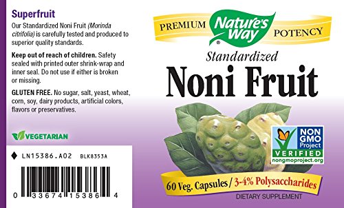 -. Binding : Health and Beauty -. Brand : Nature's Way -. Department : Health and Beauty>Health and Wellness -. EAN : 0033674153864 -. Feature : Nature's Way -. IsAdultProduct : 0 -. IsAutographed : 0 -. IsMemorabilia : 0 -. Label : Nature's Way -. LegalDisclaimer : These statements have not been evaluated by the Food and Drug Administration (FDA). These products are not meant to diagnose, treat or cure any disease or medical condition. Please consult your doctor before starting any exercise or nutritional supplement program or before using these or any product during pregnancy or if you have a serious medical condition. -. Manufacturer : Nature's Way -. Model : 15386 -. MPN : 15386 -. NumberOfItems : 1 -. PackageQuantity : 1 -. PartNumber : 15386 -. ProductGroup : Health and Beauty -. ProductTypeName : HEALTH_PERSONAL_CARE -. Publisher : Nature's Way -. ReleaseDate : 2010-05-13 -. Size : 60 -. Studio : Nature's Way -. Title : Nature's Way Noni Fruit, 60 Vcaps -. UPC : 033674153864