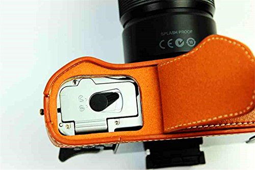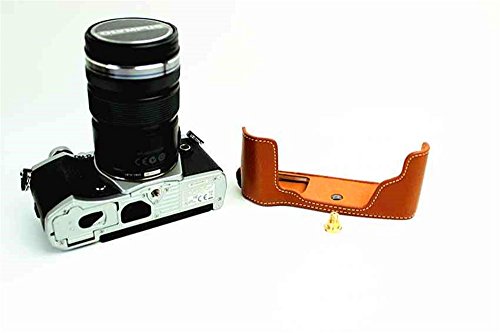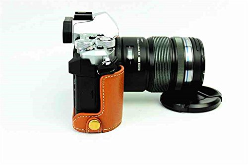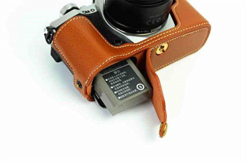 BolinUS Handmade Genuine Real Leather Half Camera Case Bag Cover for Olympus OM-D E-M5 Mark II Bottom Opening Version + Hand Strap - Brown