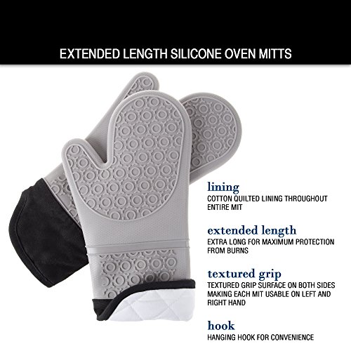 Silicone Oven Mitts – Extra Long Professional Quality Heat Resistant with Quilted Lining and 2-sided Textured Grip – 1 pair Gray by Bedford Home