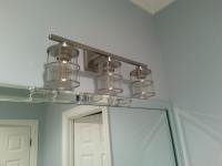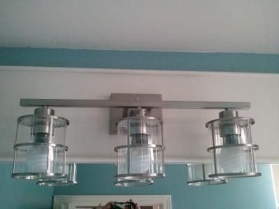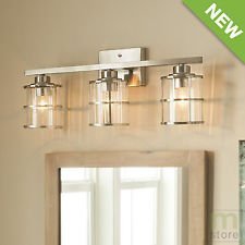 3 light vanity bar with clear ribbed glass shades, and decorative nickel accents. Dimable with select household dimmers.