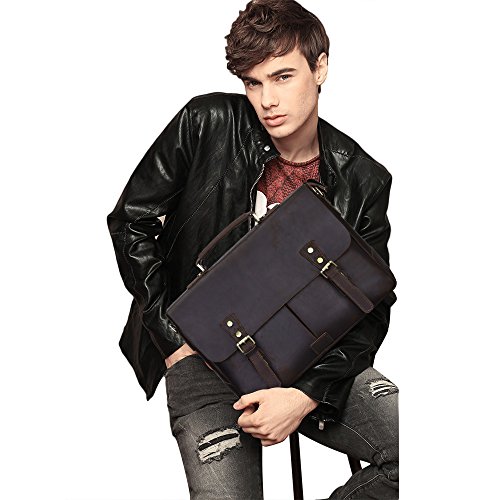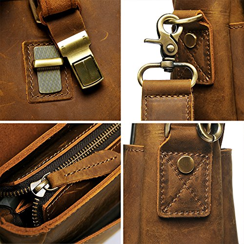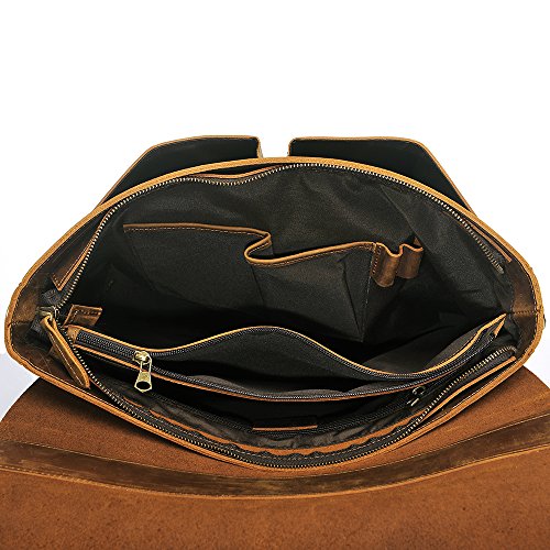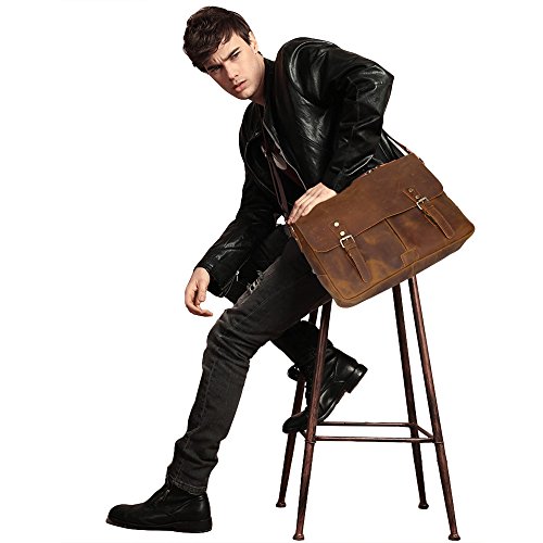 -. Feature : HIGH QUALITY MATERIAL: Superior cowhide crazy horse leather, handcrafted by artisans working with leather for decades to ensure long lasting durability / DRUABLE HANDLES: Carrying handle made of the same cowhide and fixed by high quality hardware, which brings comfortable feeling and makes the bag durable / GREAT SIZE FOR CASUAL AND WORK: Dimension of the bag is about 12.2(H)*16.1L)*4.3(W)inch, designed to carry most 15.6 inch laptop computers / PLENTY OF ROOM: 2 Main Compartment + 2 liner pouches + 1 Inner Zipper Pocket + 1 Rear Zipper Pocket. Most of your belongings can be loaded / WEARABILITY: The messenger bag features a wide shoulder strap that eliminates shoulder fatigue. The shoulder strap is removable and adjustable. The bag can be carried by the handle, worn on shoulders, and positioned across body