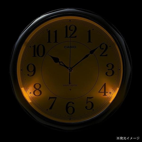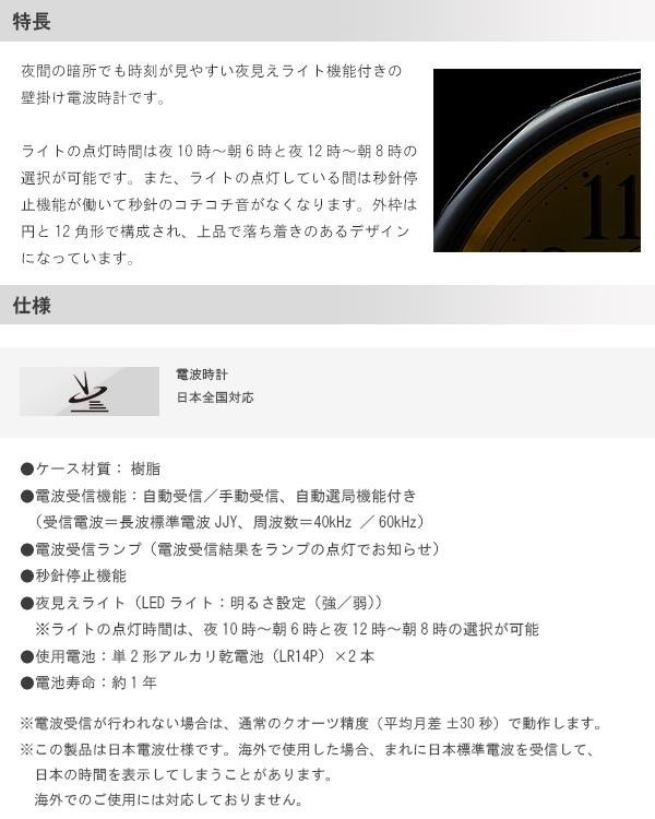 ライトの点灯時間は夜10時~朝6時と夜12時~朝8時の選択が可能です。また、ライトの点灯している間は秒針停止機能が働いて秒針のコチコチ音がなくなります。外枠は円と12角形で構成され、上品で落ち着きのあるデザインになっています。 |
