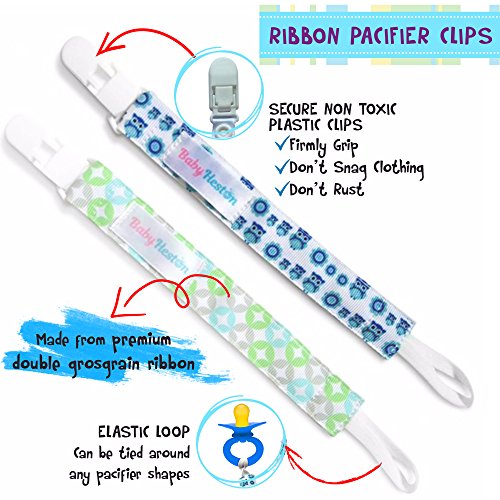 Complete Comfort Relief For Your Teething Baby. Neutral Gender Designs Perfect For Baby Boy or Girl! Made With Love And High Quality Materials Approved By CPSIA. Ideal Baby Shower Gift. / MULTIFUNCTIONAL AND COMPATIBLE WITH MAJOR BRANDS: Say Goodbye To Losing Your Favourite Soothie With These Irresistible, Versatile Pacifier Clips That Keep Soothies Close To Baby And Off The Floor, Away From Harmful Germs. Not Just To Hold Pacifiers But Teething toys, Drooling Bibs and Favourite Blanket! / SAFETY, USA STANDARD APPROVED, NO BPA, NO LEAD, NO PHTHALATE: All Products Meet The Highest Safety Standards Approved by CPSIA. Non Toxic, BPA, LEAD and PHTHALATES FREE. Made of Secure Plastic Clips That Don't Rust Like Metal clips! / 100% CUSTOMER SATISFACTION GUARNTEED: If For Any Reason You Are Not Completely Satisfied We Offer 100% 90 days Money Back Guarantee. / EASY TO USE, DURABLE AND WASHABLE: Ribbon Pacifiers are Machine Washable and Fade Resistance.