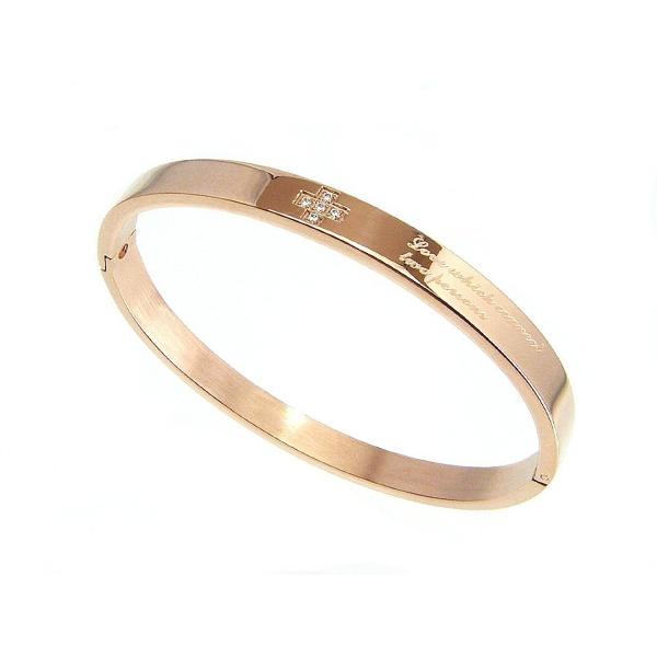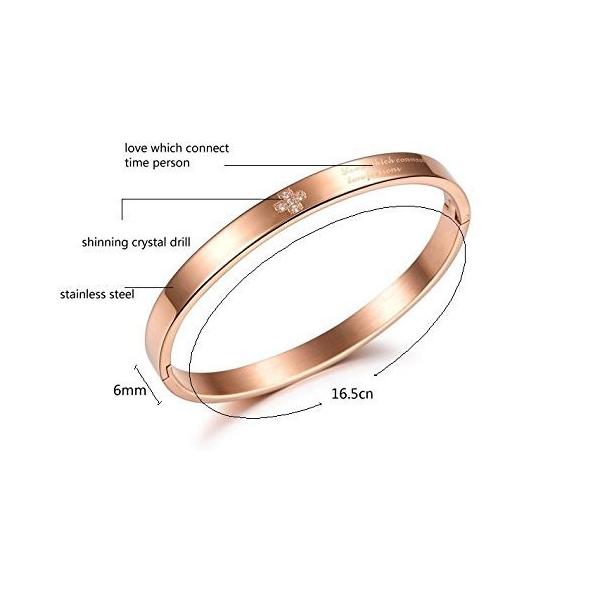 ・商品説明今、トレンドのメッセージ刻印入りのバングルです☆ ワンポイントにクリスタル入りのクロスがオシャレな目立ちすぎないデザイン。 シンプルで着けやすいステンレスリングブレスレットです。 刻印されている文字は「love which connect two person 」です。 開閉式バングルとなりますので、着用時は引っかかり部分をずらし、開いた状態にしてから装着して下さい。! 金属アレルギーの方にも安心なサージカルステンレス316Lを使用。 錆や変色もなくお手入れが簡単なので、アクセサリーをあまり使ったことがない方でもお気軽にご購入いただけます。 ※海外量生産品の為、仕上がりに多少のキズ・汚れ等のムラがある場合がございます。予めご了承ください。